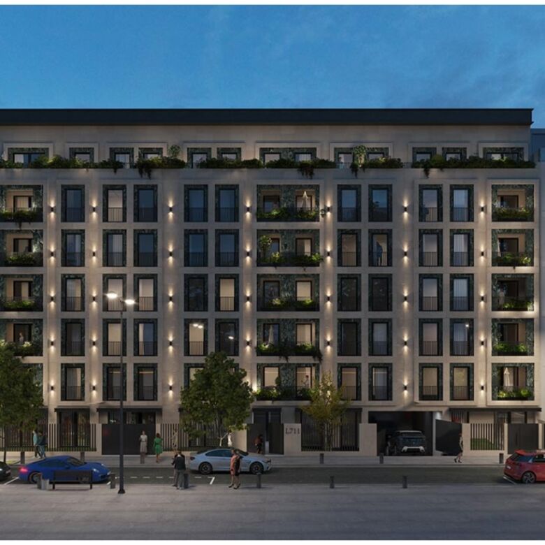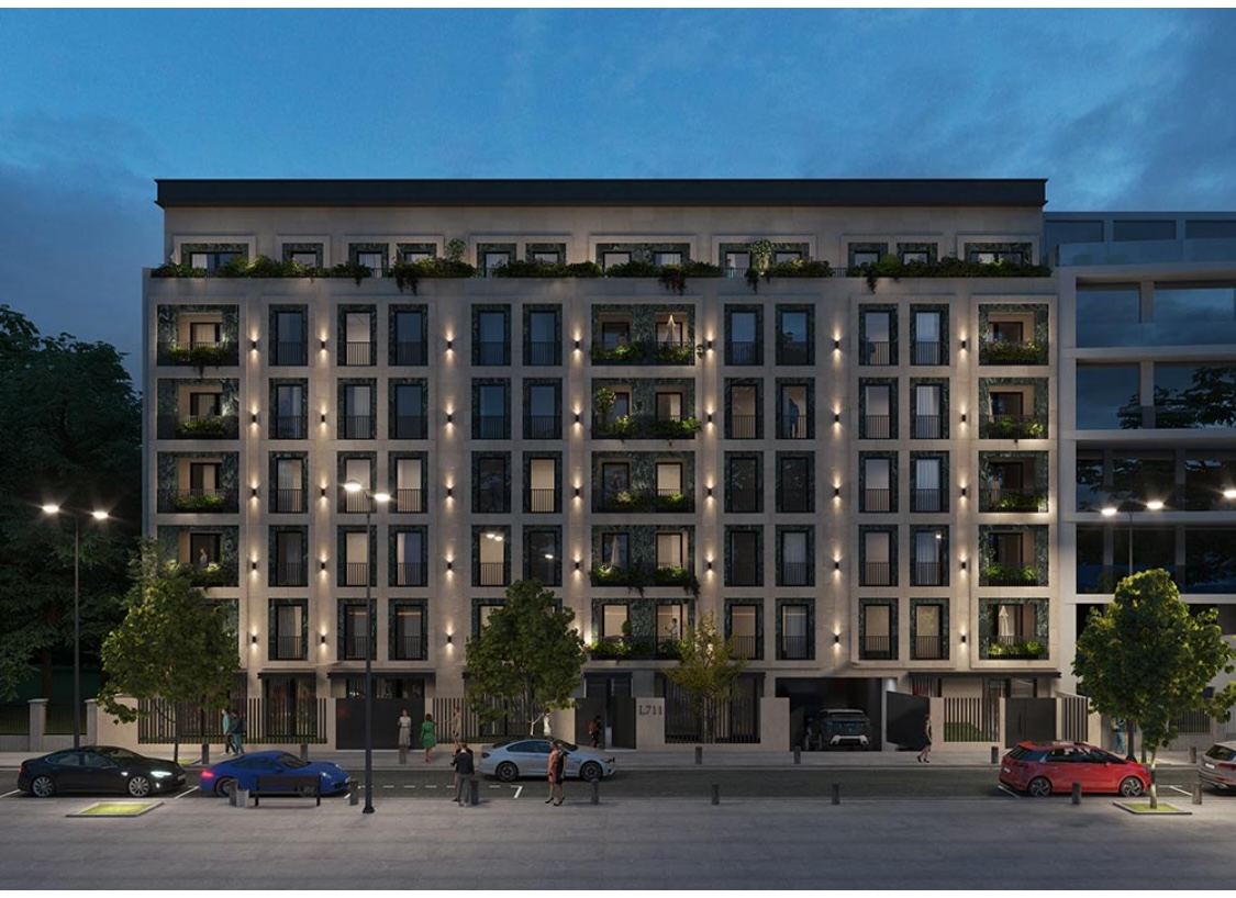 The apartment is located on the 1st floor, in a building whose facade will be a combination of brick, stone and glass.